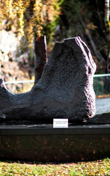 The energy and shape of the sculpture easily give associations to the surrounding natural landscape, especially the water and the waterfall's fierce power/energy.